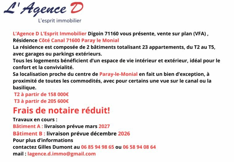 L’Agence D L’Esprit Immobilier Digoin 71160 vous présente, vente sur plan (VFA), Résidence Côté Canal 71600 Paray le Monial