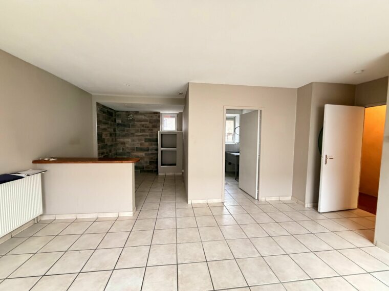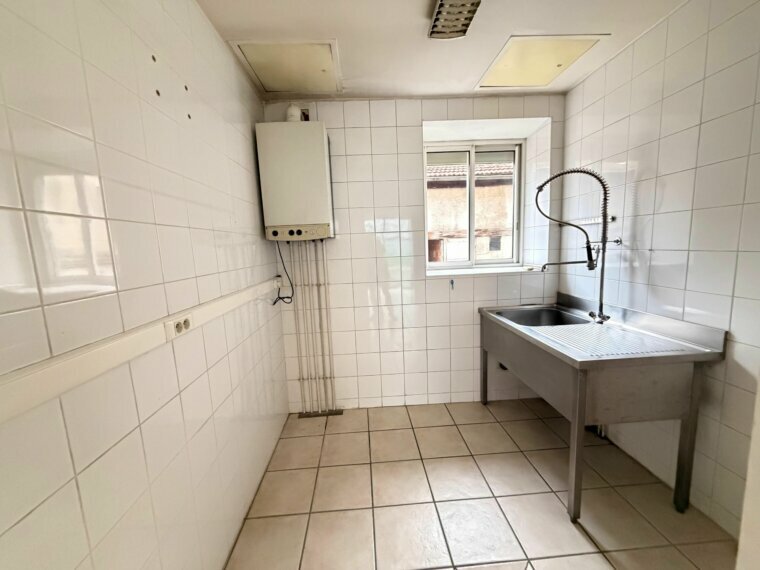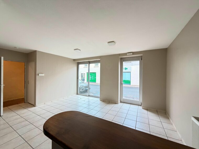 A louer en Rdc, local de 43 m², ancienne pizzaria avec vitrine, bail tous commerces aucun travaux à prévoir, (Restauration / bureaux/ coiffure. etc), cuisine non-équipée, coin plonge, salle et wc + cave et cour à l’arrière.