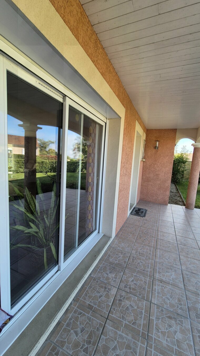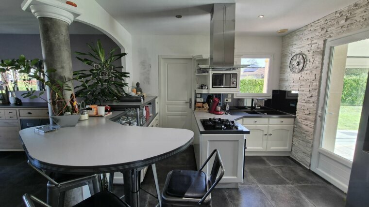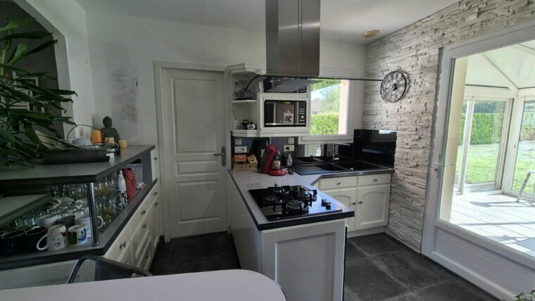 Un salon séjour lumineux ouvert sur une cuisine équipée donnant sur véranda. 3 chambres avec placards