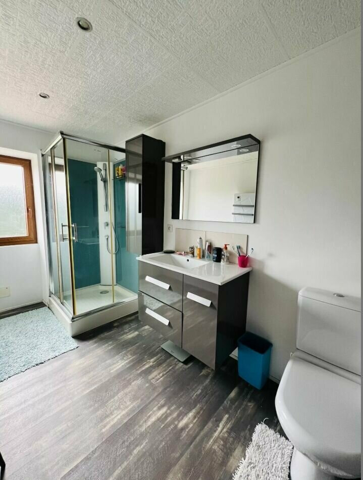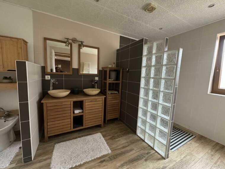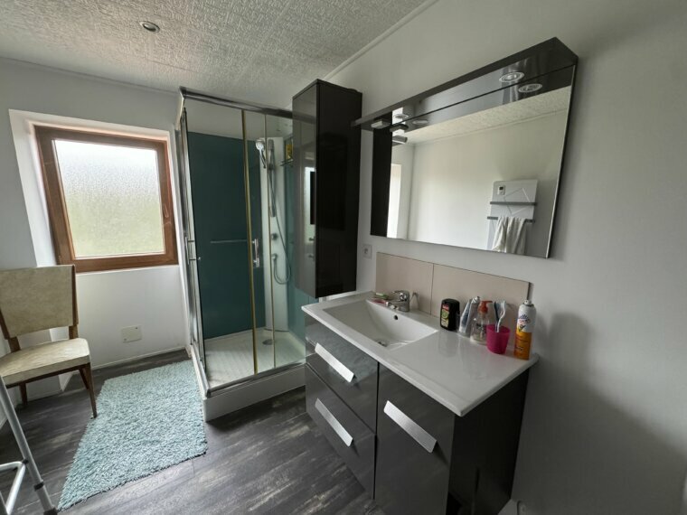 Au rez-de-chaussée, on trouve une cuisine équipée, un salon séjour, une suite parentale avec une grande salle d’eau, des toilettes, une buanderie et une cave.