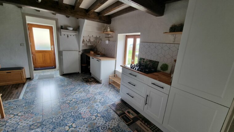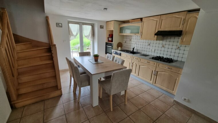 RDC, cuisine équipée ouverte sur salon/ séjour, cuisine d’été, salle d’eau avec WC, petite buanderie, à l’étage: