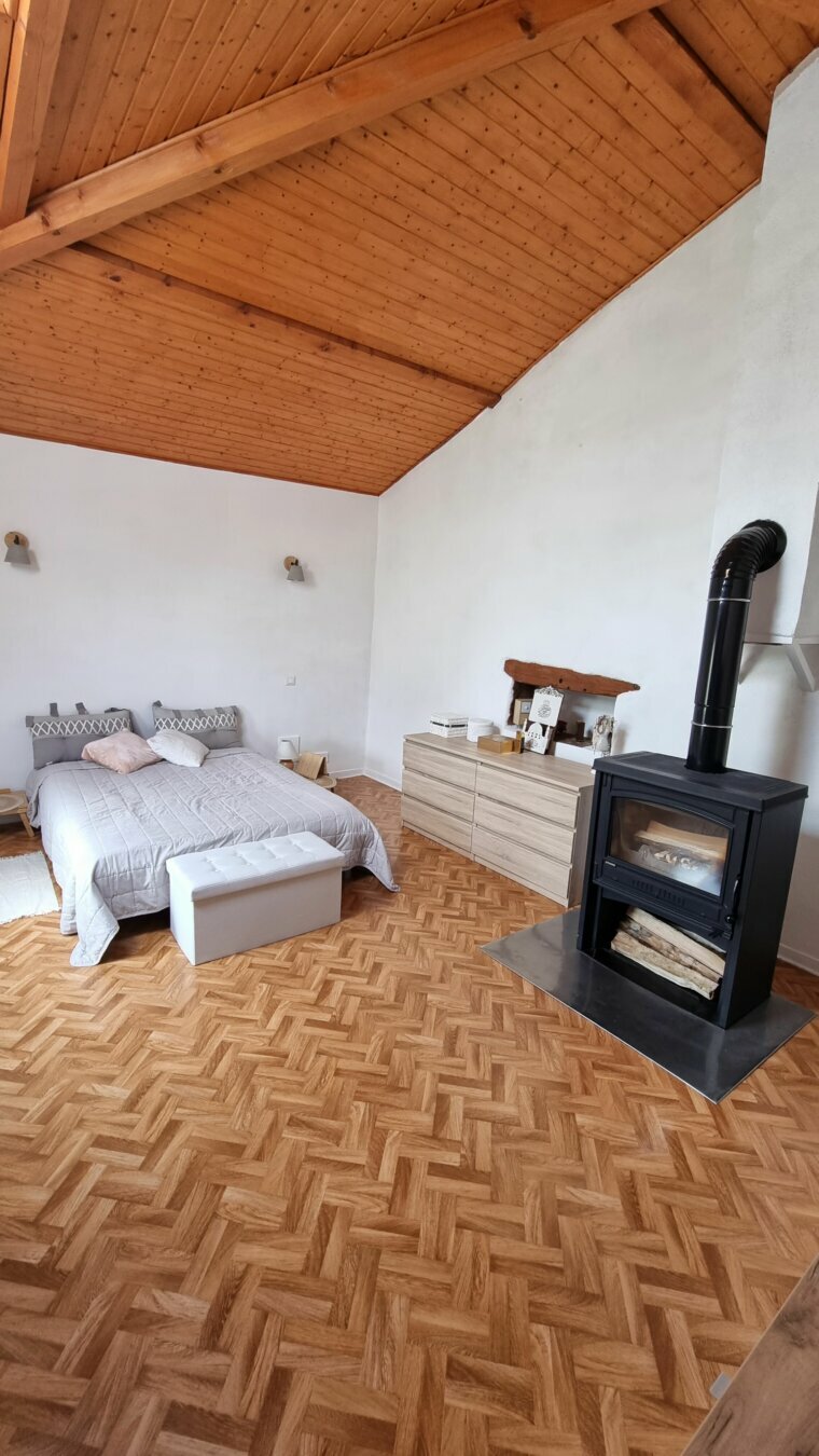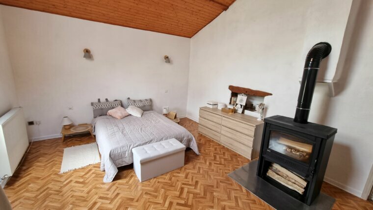 4 belles et grandes chambres avec possibilité d une 5 iem car tout est ok pour, il restera simplement à peindre les murs ainsi que de prévoir un revêtement sol, salle d’eau équipée d une baignoire d une douche et d’un WC. Chauffage, pompe à chaleur, poêle au bois, cheminée. Un puits, une cave. Garage, terrasse, le tout sur un terrain de 1920 m².