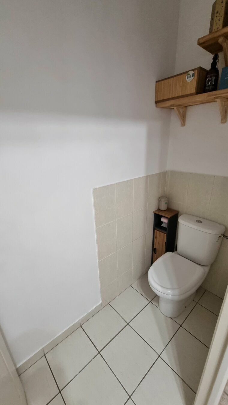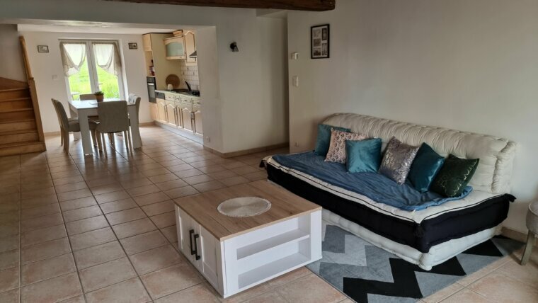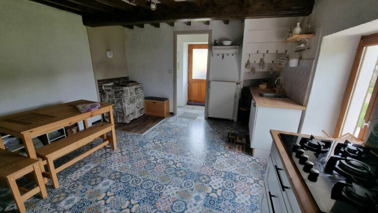RDC, cuisine équipée ouverte sur salon/ séjour, cuisine d’été, salle d’eau avec WC, petite buanderie, à l’étage: