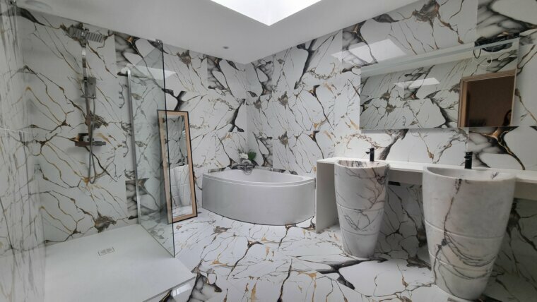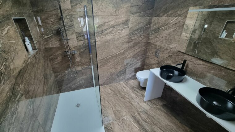 Salle de bains avec douche et baignoire, double vasques en pierres de marbre faits mains d’environ 9 m²